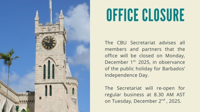 The CBU Secretariat advises all members and partners that the office will be closed on Monday, December 1st, 2025, in observance of the public holiday for Barbados’ Independence Day. The…